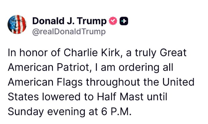 特朗普连发3条帖文下令全国降半旗志哀,直至14日傍晚6时。