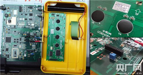 苏业远的担心变成了现实。与钦南区同批采购设备的桂平市发现,所采购单价7万元、自称英国梅克罗尼牌的超声波流量计,无法开机、充不进电,就把设备送到了自治区节能监察中心。广西壮族自治区节能监察中心副主任程正椿说,超声波流量计是桂平节能监察中心拿上来的,他们首先发现开不了机。请专业人员打开一看,交货单上写的是“梅克罗尼”,外观没有任何梅克罗尼的标识,打开以后,显示器电路板是金鹏电子,主电路板是APEX。但真的产品两个都是有梅克罗尼的标。