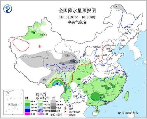 12日8时至13日6时,甘肃中部、青海南部局地降雪或雨夹雪1~4毫米;江西东南部、福建中南部、广西东南部等地部分地区降中雨,福建南部局地降大雨。