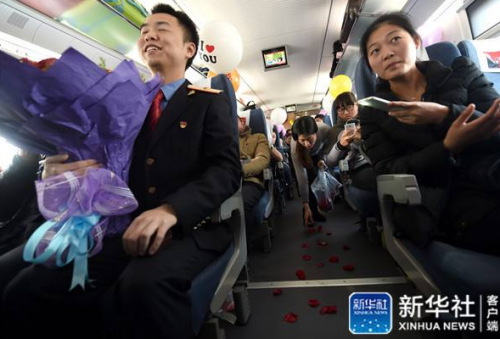 1月16日,张李在高铁车厢内向女友求婚。 新华社记者韩传号摄