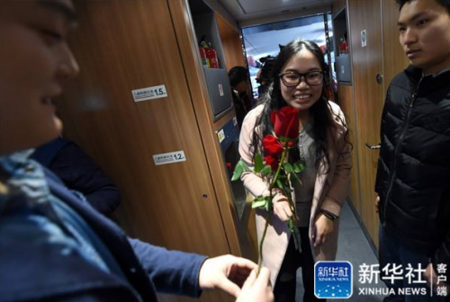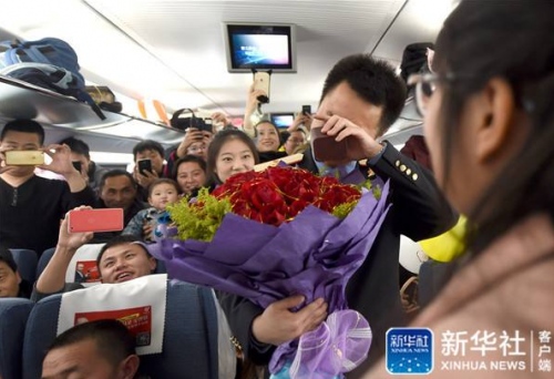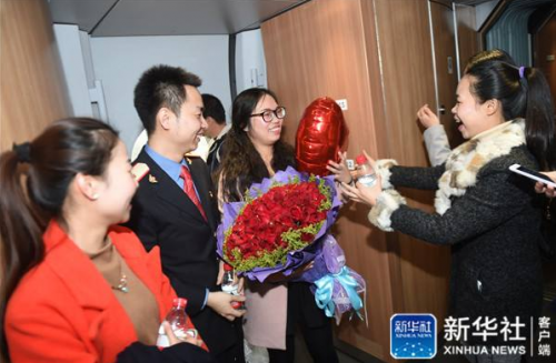 1月16日,张李的同事向小杨(左二)献花,将她引导到张李所在车厢内。 新华社记者韩传号摄