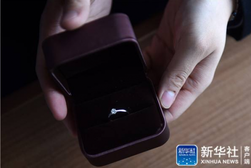 1月16日,张李在高铁上展示自己准备的求婚戒指。新华社记者韩传号摄