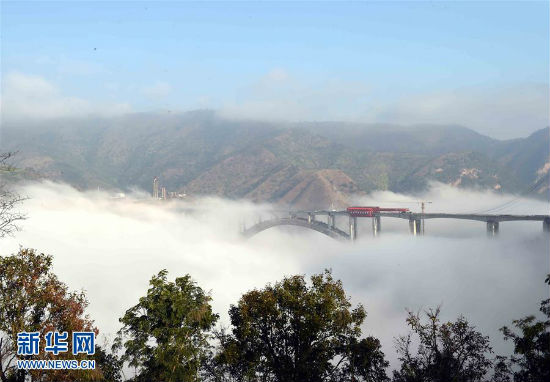 南盘江特大桥位于云南省弥勒市与丘北县交界的南盘江上,大桥全长852.43米,主桥单跨416米,桥面凌空高出江面270米,是客货共用上承式钢筋混凝土铁路桥。据悉,云桂铁路设计时速200至250公里,建成通车后,从昆明到南宁的行车时间将由现在的12个小时缩短为5个小时左右。(新华社记者 杨宗友 摄)