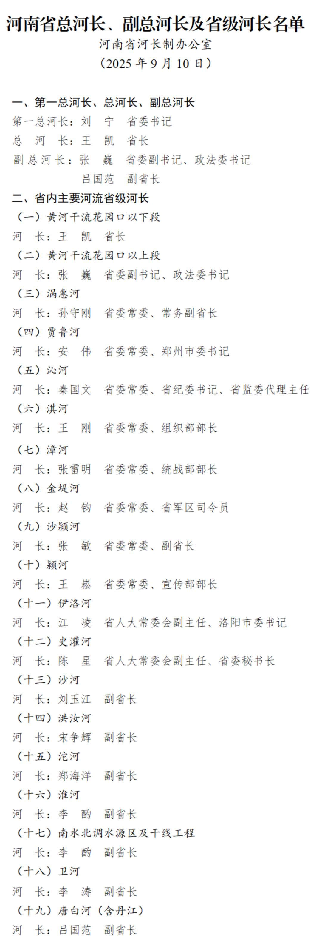 河南省总河长、副总河长及省级河长名单公布