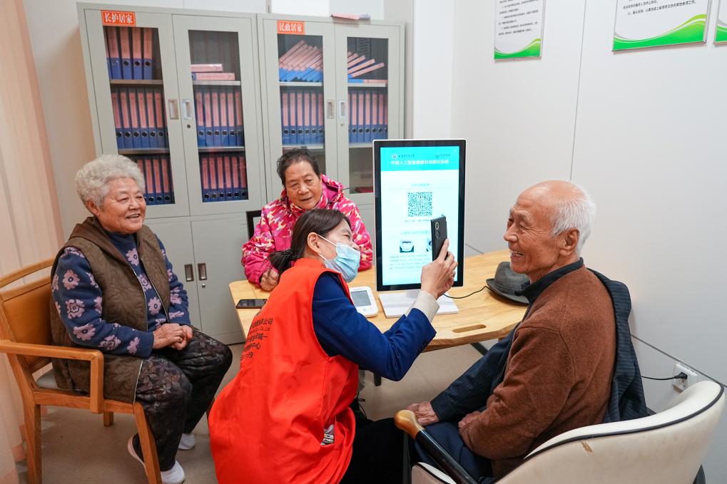 2025年10月,老人们在山东省淄博市张店区一社区日间护理中心测量健康数据。新华社记者 朱峥 摄