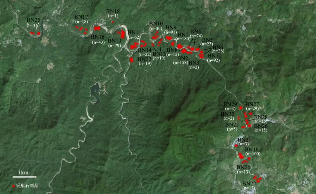 本年度的调查以正在发掘的南或河遗址为中心,分向上游方向和下游方向进行了全面调查。共发现旧石器地点30处,其中正在发掘的南或河遗址命名为第1地点(BN1),其他地点按发现的先后顺序依次编号至BN30。